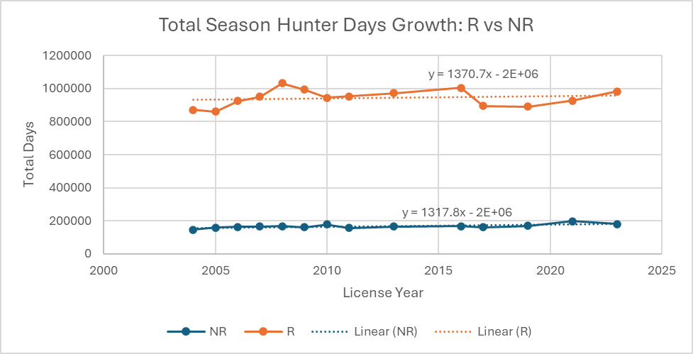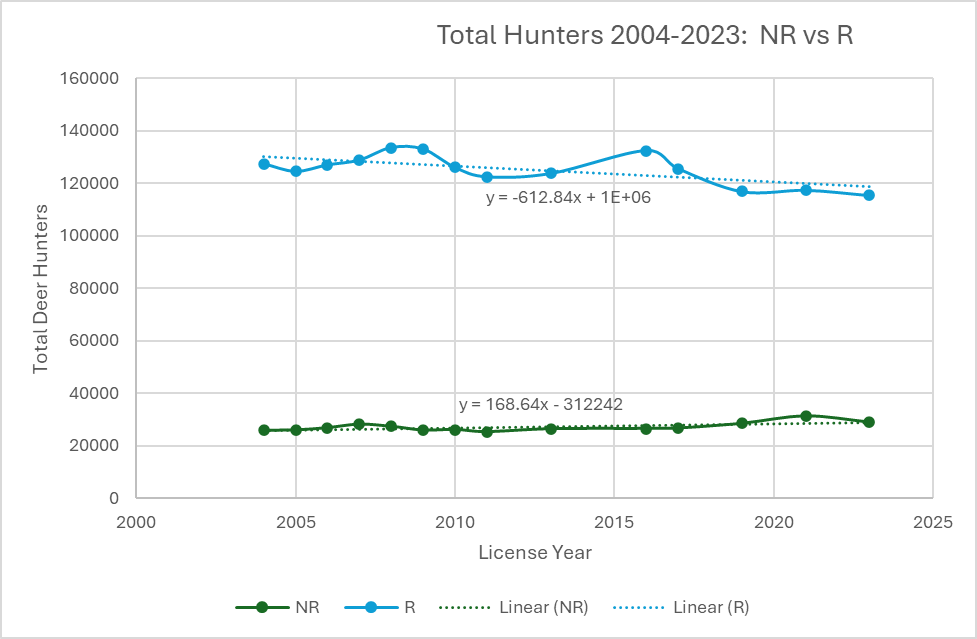 (Change in Resident pressure from 2004 to 2023 is 112,073 hunter days. The average NR spends 6 days deer hunting. This change in Resident pressure is roughly equal to 18,678 extra NR deer hunters on the landscape. In the same time frame resident hunters have decreased by 12,016.)